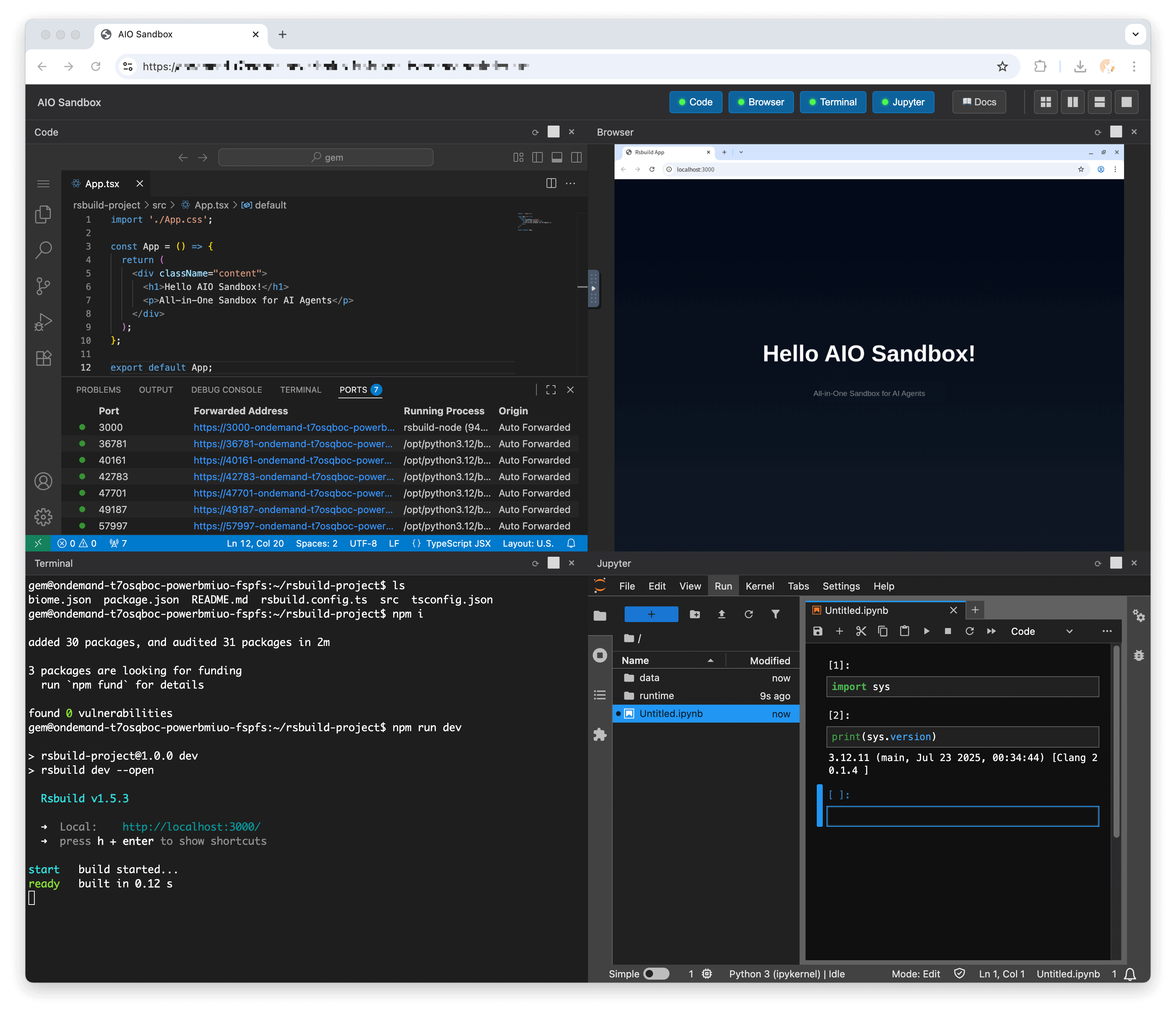Traditional sandboxes are single-purpose (browser, code, or shell), making file sharing and functional coordination extremely challenging. AIO Sandbox solves this by providing: