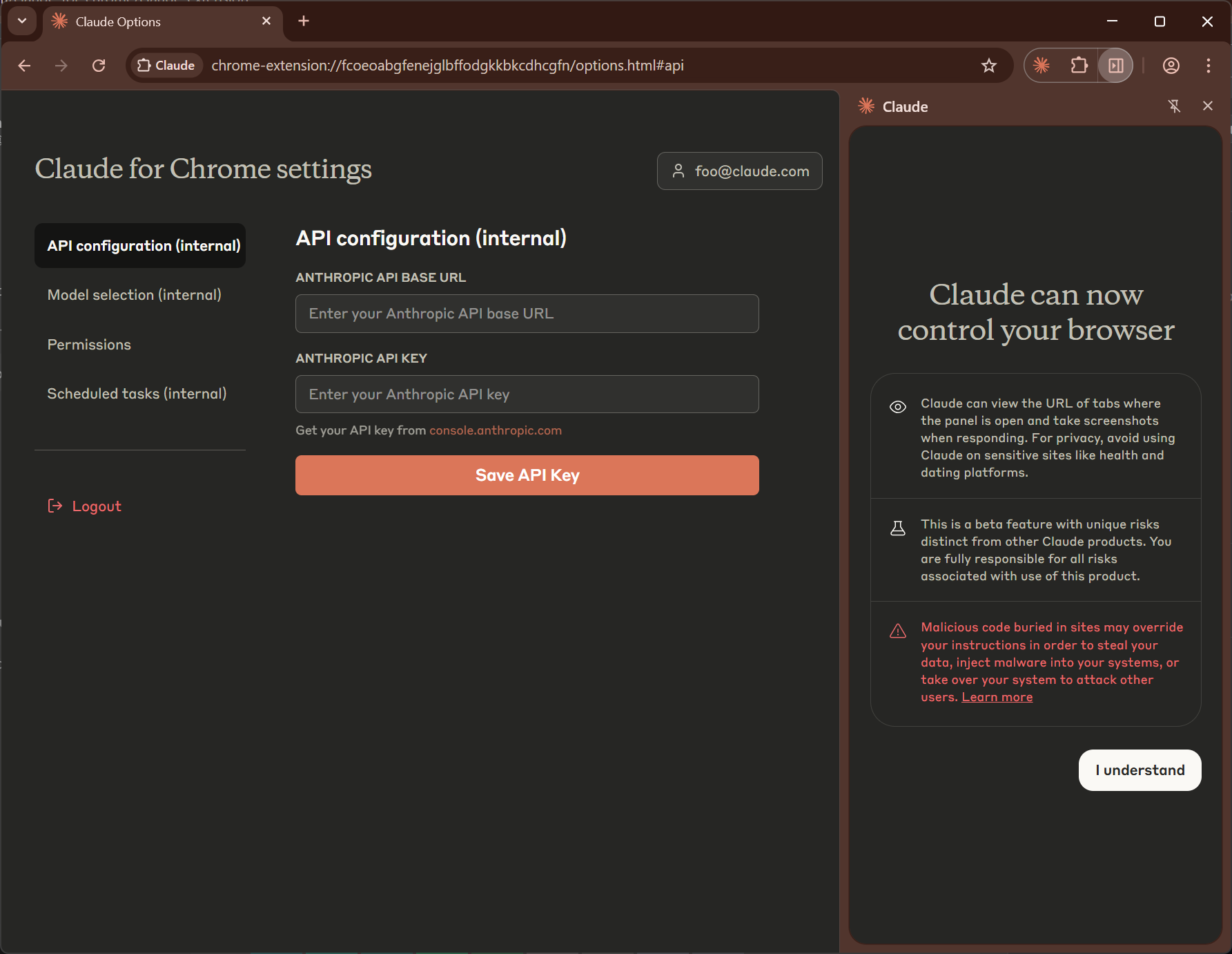On the Options page, click API configuration (internal), and then enter your API Key in the input box below Anthropic API Key.