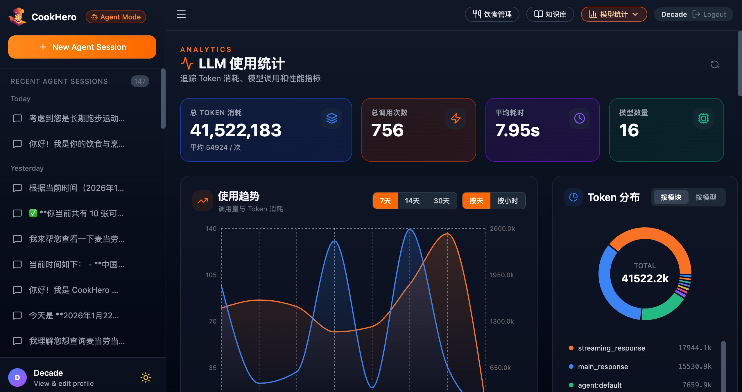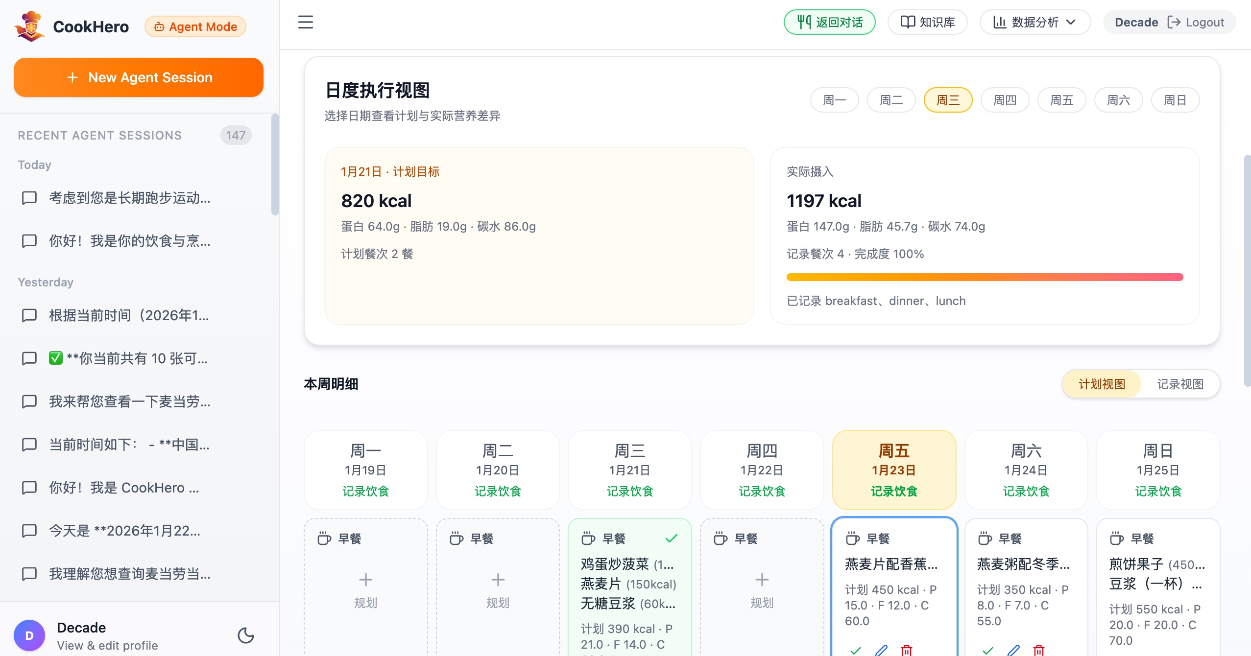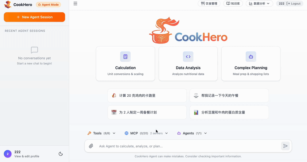 CookHero(烹饪英雄)是一个融合 LLM、RAG、Agent、多模态与营养数据分析的个性化饮食管理平台。它不仅是菜谱库,更是一位能陪你做计划、做记录、看数据、给建议的“饮食管理英雄助手”,帮助你把烹饪与健康目标变成可执行的日常。