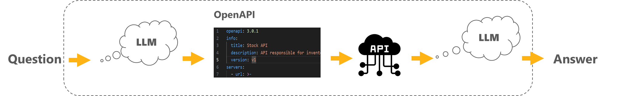 OpenAPI + LLM for prompt construction is a concept that combines OpenAPI, a standard for documenting and describing RESTful APIs, with large language models (LLMs). This fusion allows for the automated generation of prompts or queries for interacting with APIs. By using LLMs to understand the OpenAPI specifications and generate natural language prompts, it simplifies and streamlines the process of interfacing with APIs, making it more user-friendly and accessible.