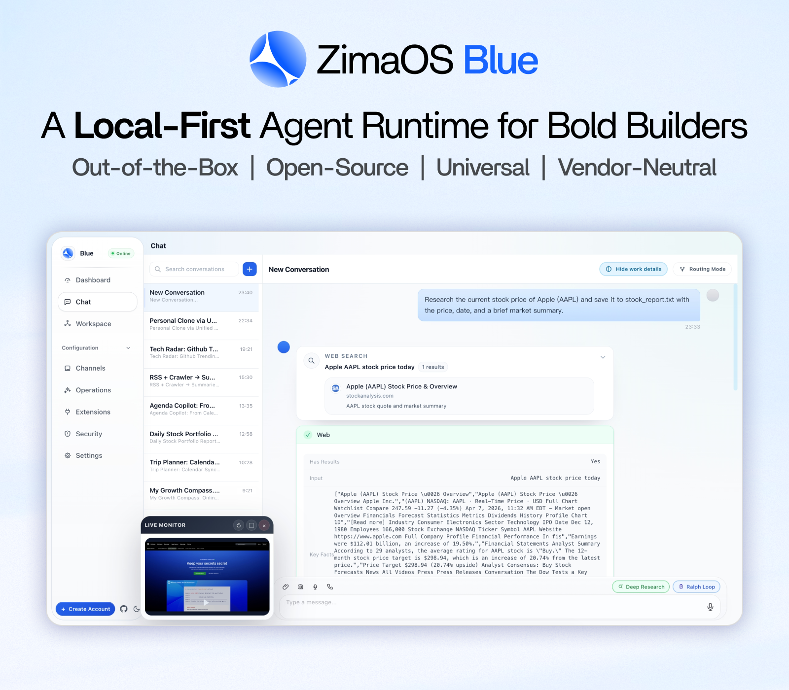 ZimaOS Blue - A Local-First Agent Runtime for Bold Builders. Out-of-the-Box, Open-Source, Universal, Vendor-Neutral