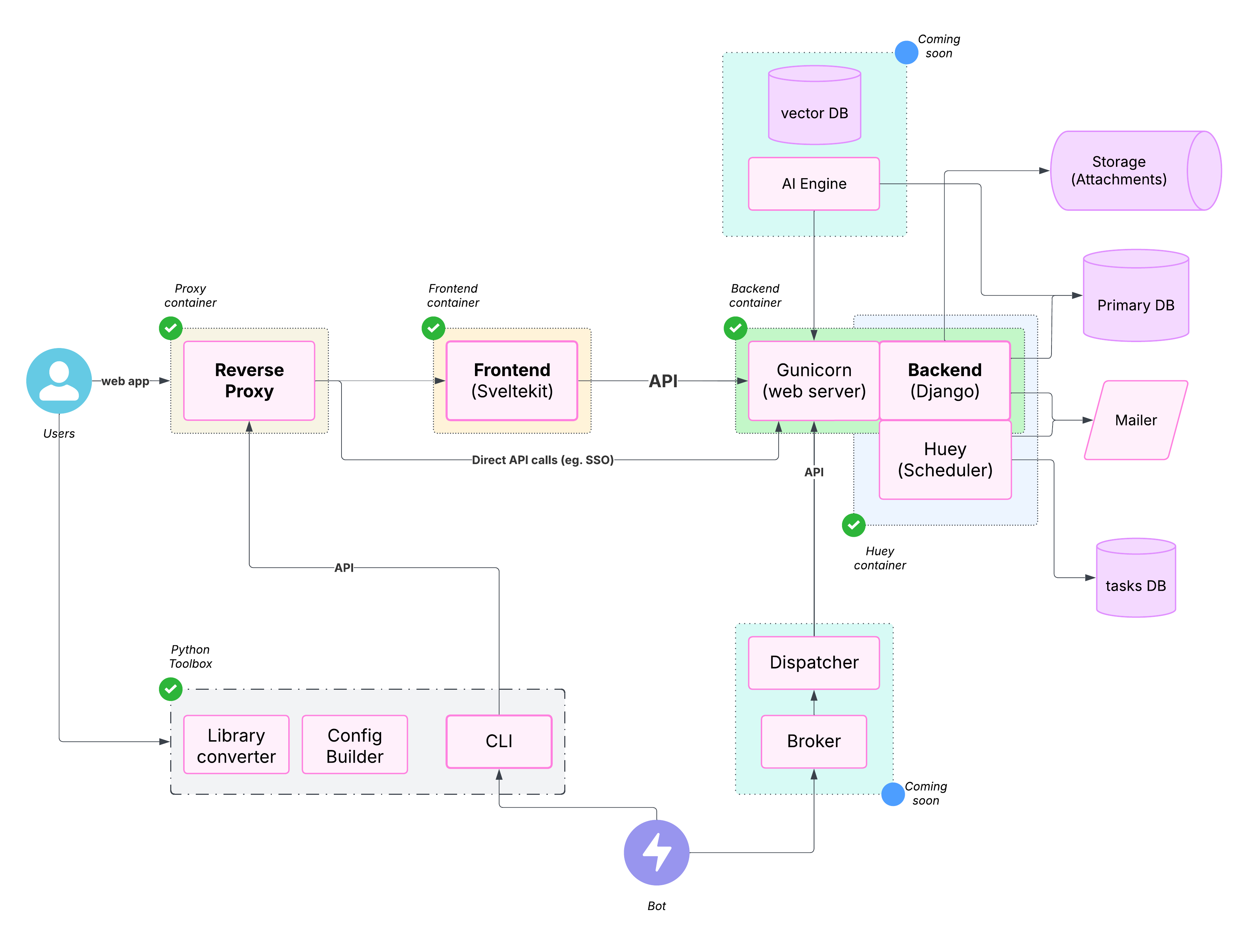 The docker-compose-prod.yml highlights a relevant configuration with a Caddy proxy in front of the frontend. It exposes API calls only for SSO. Note that docker-compose.yml exposes the full API, which is not yet recommended for production.