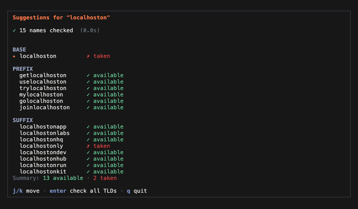 • Fast — 30 TLDs in under 2 seconds. 59 with --extended.