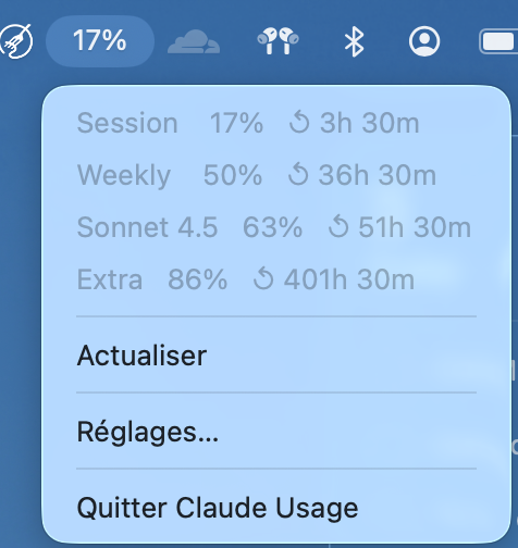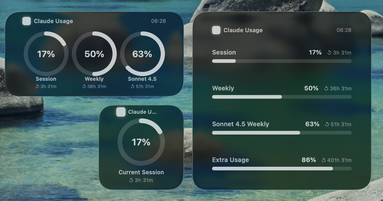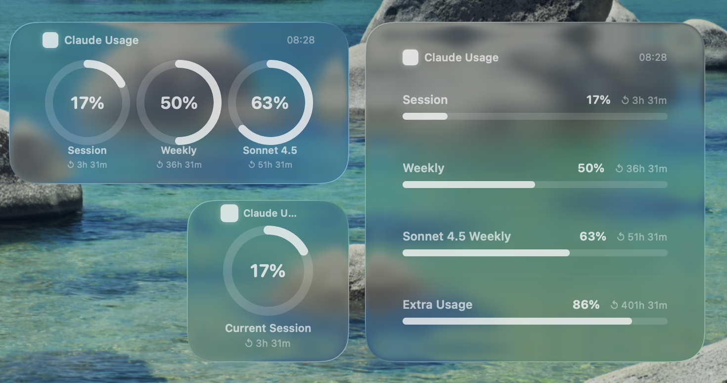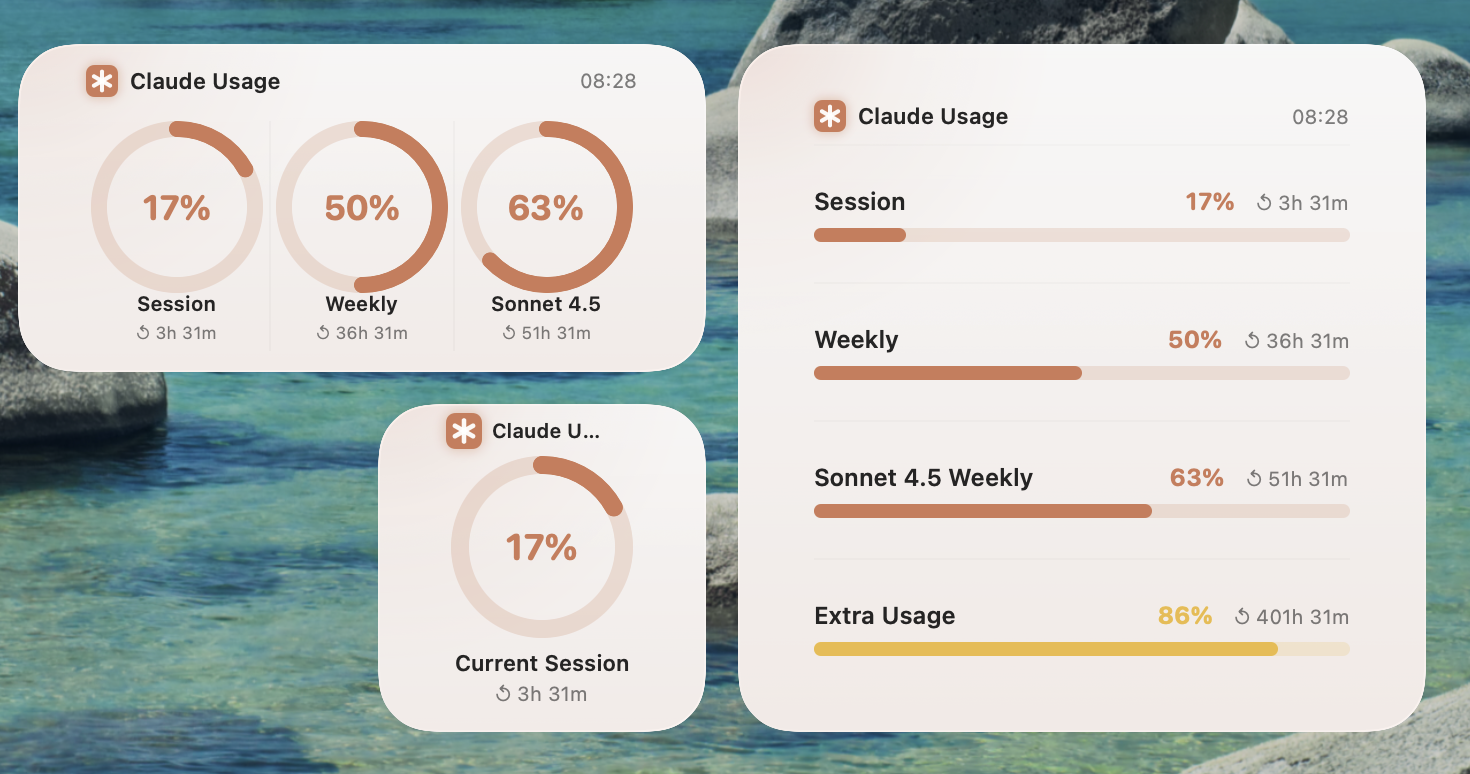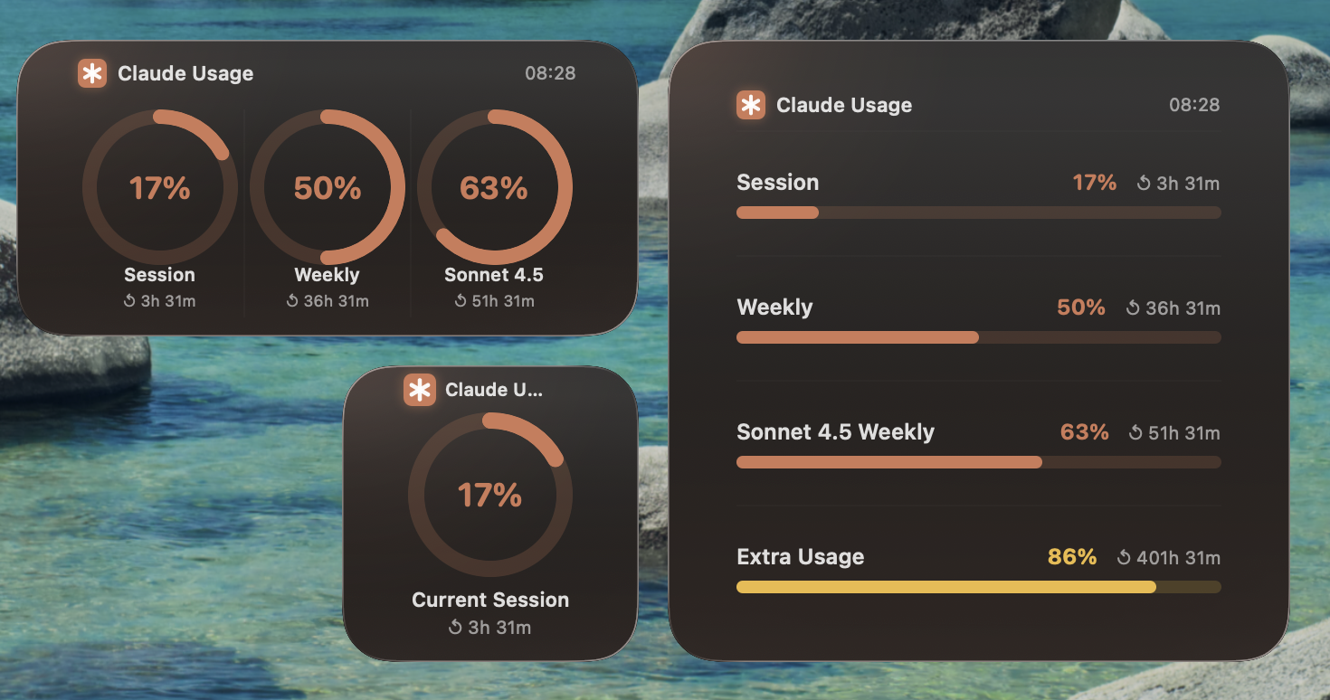 macOS menu bar app + desktop widget showing Claude usage in real time — session, weekly, Sonnet 4.5 & extra credits. One-command install, no Apple Developer account needed.