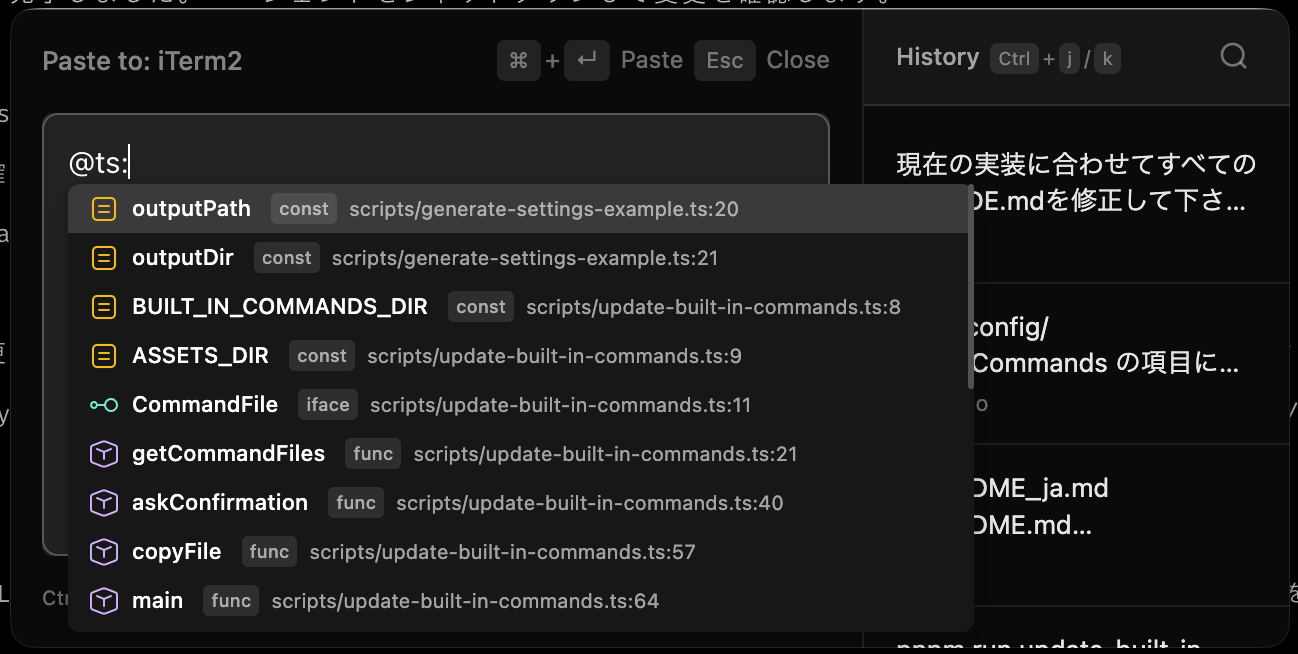 • Symbol Search - Search code symbols by typing @<lang>:<query> (e.g., @ts:Config)