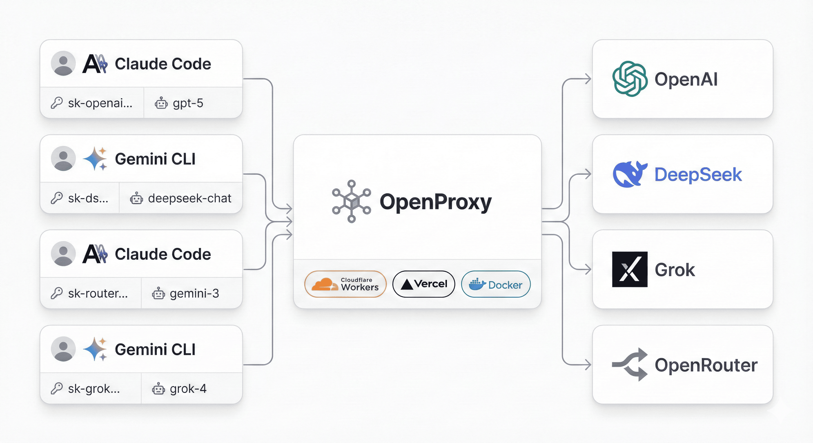 OpenProxy is an API translation gateway that converts between different AI providers (Anthropic, Gemini, OpenAI). Use any client to call any provider.