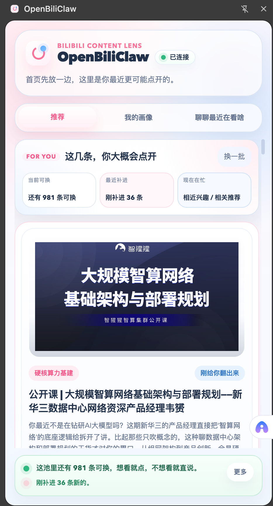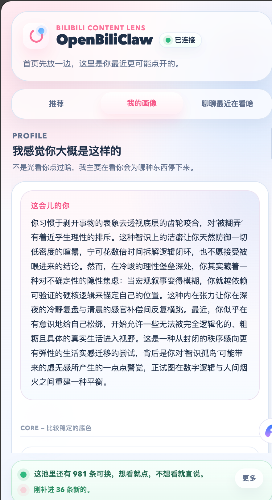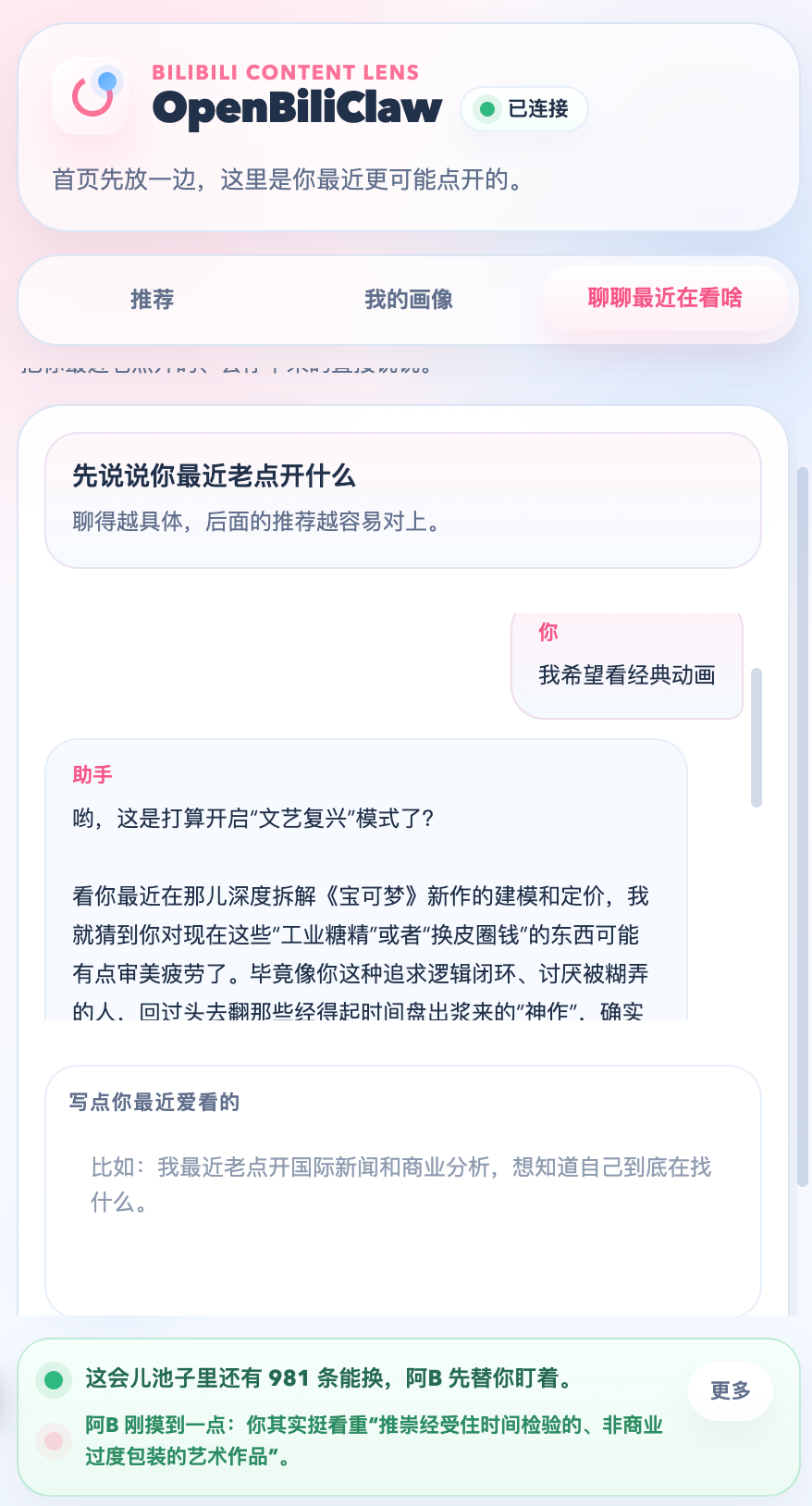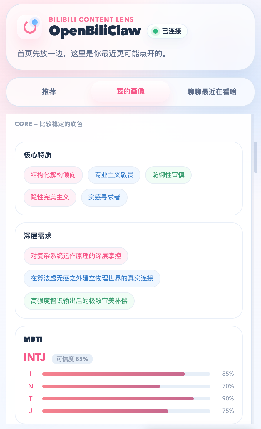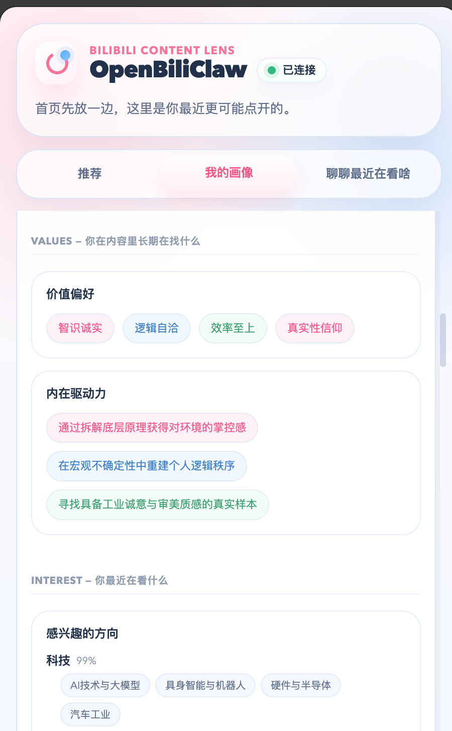 OpenBiliClaw 反过来。 它是一个本地运行的 AI Agent——先深度理解你,再根据对你的理解主动去全站搜寻你会喜欢的内容: