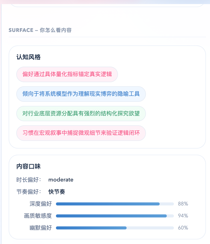 不是从视频出发匹配标签,而是从你出发。通过行为分析推断 MBTI、认知风格、深层心理需求,构建五层灵魂画像(事件→偏好→觉察→洞察→灵魂)。它理解的是你这个人,不是你的点击记录。