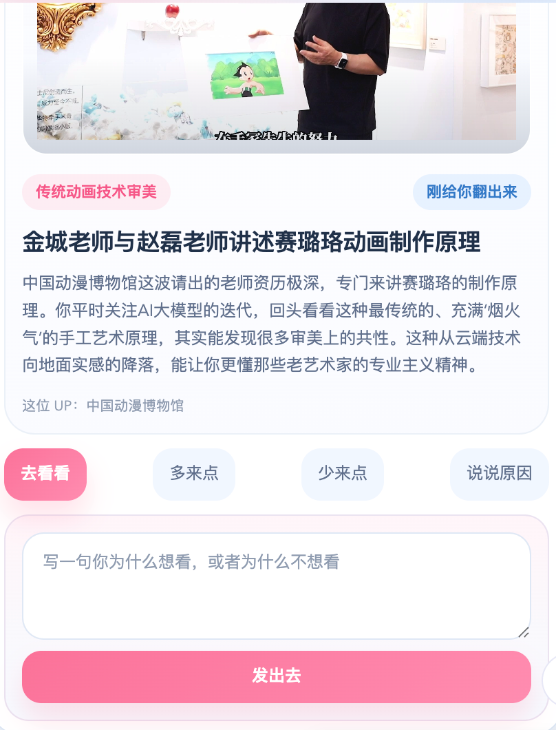 • 💬 有温度的推荐 — 不是"因为你看过类似视频",而是像朋友一样解释为什么你会喜欢