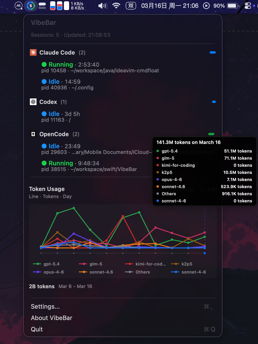 VibeBar tracks token usage across supported AI tools with detailed analytics and visualization: