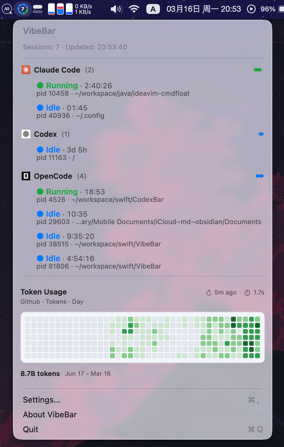 VibeBar is a lightweight macOS menu bar app that monitors live TUI session activity for Claude Code, Codex, and OpenCode.